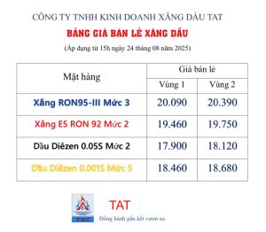 TAT Điều chỉnh giá bán lẻ xăng dầu từ 15 giờ Ngày 24 Tháng 08 Năm 2025