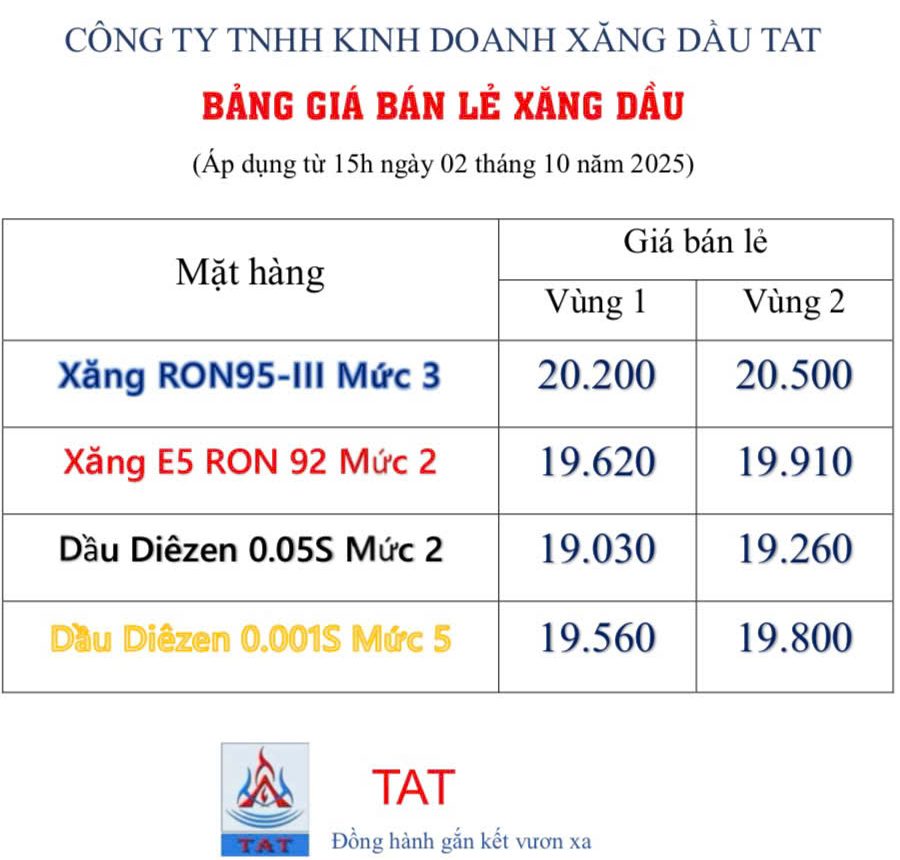 TAT Điều chỉnh giá bán lẻ xăng dầu từ 15 giờ Ngày 02 Tháng 10 Năm 2025